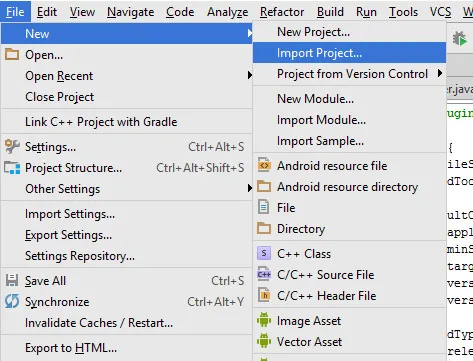 Ardından Android Studio üzerinde, File - New - Import Project menüsüne tıklayınız. Açılan sayfadan Eclipse ortamında kaydettiğiniz kaynak klasörünüzü seçiniz.