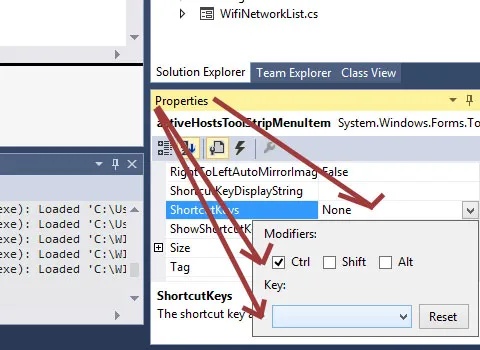 MenuStrip nesnenize ait, bir öğenin üzerinde seçili durumda iken, Properties kısmında ShortcutKeys kısmına tıklayıp, Modifiers'den Ctrl, Shift, Alt tuşlarını aktif edebilir, ayrıca Key'den tuş seçimi yapabilirsiniz. Seçiminizi yaptığınızda hiçbir şekilde ek kod yazmanıza gerek kalmadan, seçim yaptığınız ShortcutKeys gönderimlerinizde MenuStrip nesnesine ait öğeye OnClick işlemi yapılmış gibi davranılması sağlanmış olacaktır.