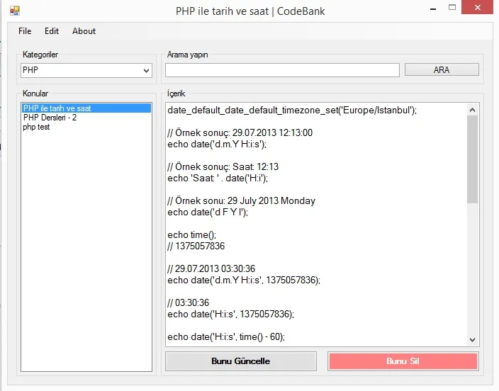 - Kod Bankası, kod parçacıkları, işinize yarayabilecek kodlar, unuttuğunuz ve hızlıca bakabileceğiniz konular, ip uçları, hatalar ve çözüm yöntemleri gibi konuları kategorili bir şekilde sınıflandırabileceğiniz, arama yapabileceğiniz, konu ekleyebileceğiniz, silebileceğiniz, güncelleyebileceğiniz yada kategori eklemesi yapabileceğiniz hızlıca her yerde kullanabileceğiniz ve taşıması tamamen kolay yardımcı bir uygulamadır.