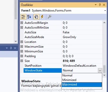 Projenin sağ köşesinde bulunan Properties menüsü altında bulunan WindowState seçeneğini Maximized olarak seçmeniz gerekmektedir.