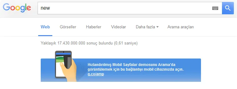 Not: Google AMP Search sayfasına buradan erişebilirsiniz fakat sayfa şuanda mobil cihazların testine açık durumda. Desktop aramaları için değildir.