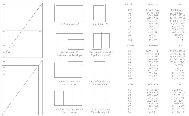 Standart kağıt boyutlarına ilişkin örnek resimler ve kağıt boyutları