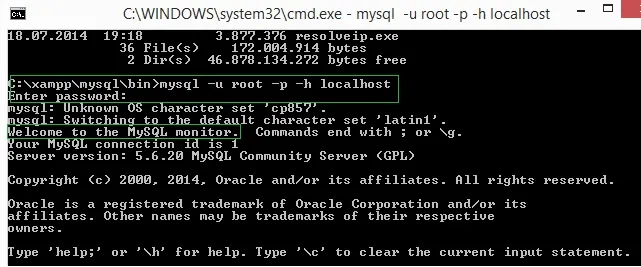 mysql -u root -p -h localhost yazınız. (mysql.exe dosyasına bağlan, -u => username, -p => password, -h => host manasına gelir. Her -u, -p, -h gibi ifadelerden sonra parametre beklenir.)