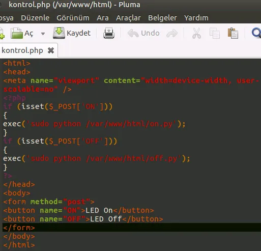 - exec ile ilgili bir dosyayı linux ortamında php ile çalıştırabiliyoruz. Aşağıdaki görseldeki kodları kontrol.php dosyasına yazınız. Ardından Raspberry Pi'nin local-ip adresi üzerinden ilgili sayfaya erişim sağlayıp yönetebilirsiniz.