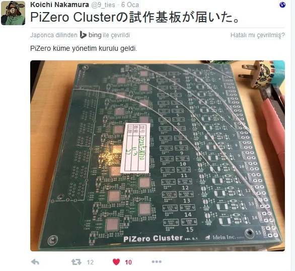 Edindiğimiz bilgilere göre, Japonya'da faaliyet gösteren Idein Inc adlı firma, PiZero Cluster Board için, 6 Ocak 2016'da attığı tweet ile ellerine ulaştıklarını açıklamış, Cluster Board için Dizgi işlemine başlamışlar.