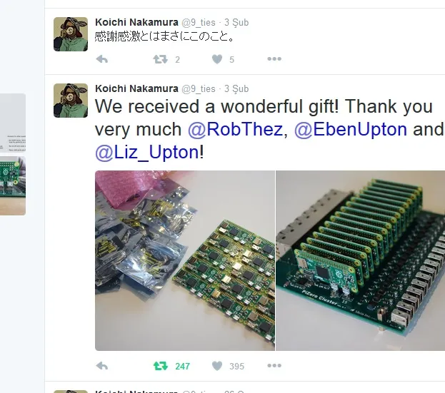 15 adet giriş Slotu bulunan PiZero Cluster için, firma kurucusu Koichi Nakamura hediye olarak aldığı Raspberry Pi Zero kartları için yine twitter üzerinde teşekkürlerini dile getirmiş.